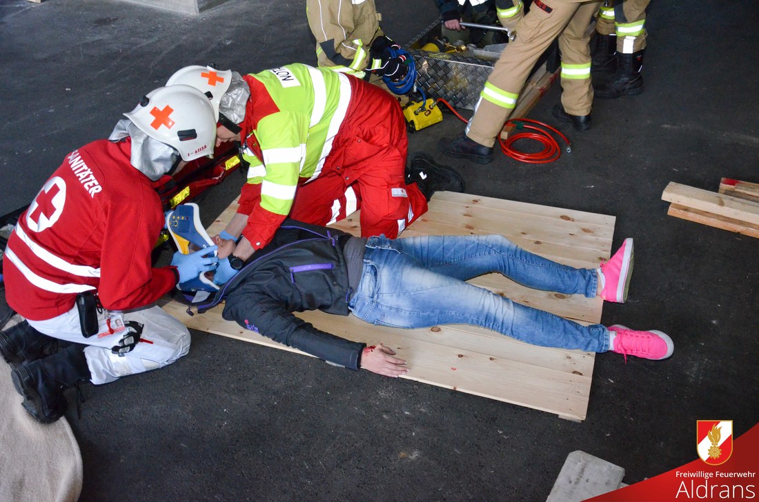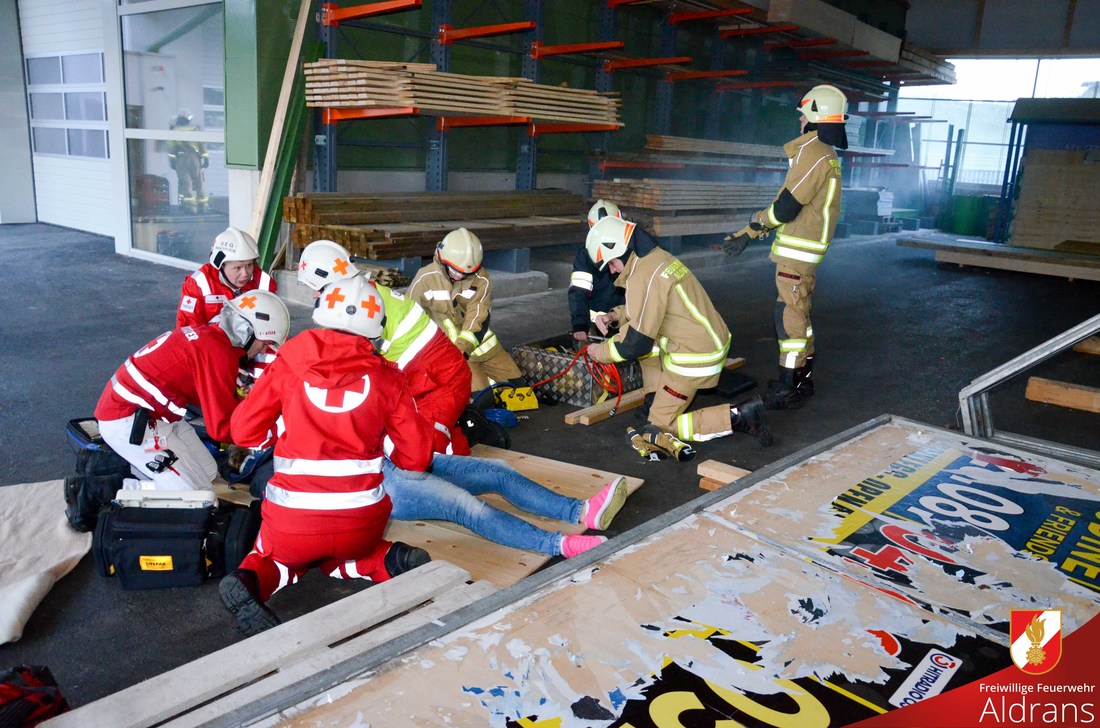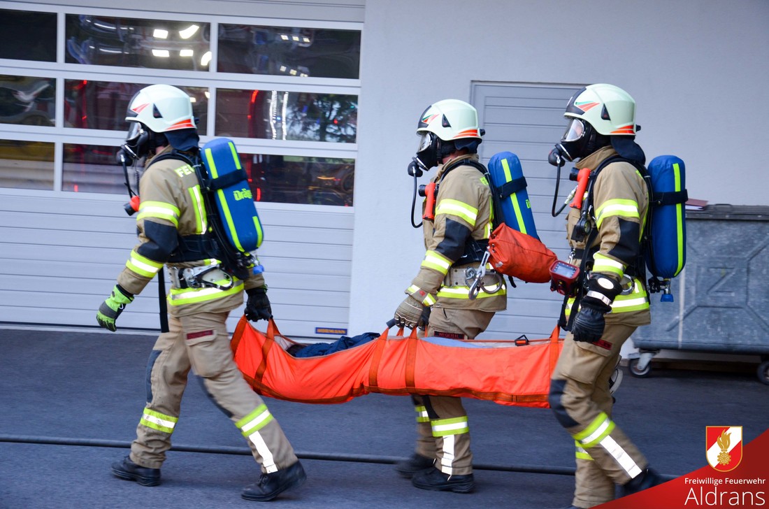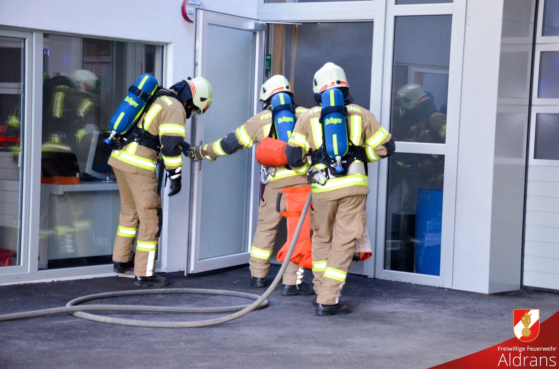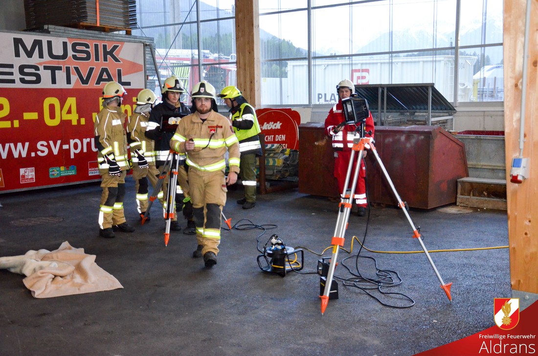 Übungsannahme war eine starke Rauchentwicklung mit vermissten Personen. Um die Wasserversorgung zu gewährleisten wurde die Fox II der FF-Aldrans am ca. 100 Meter entfernten Bach stationiert. Der vorhandene Hydrant wurde zur Speisung des Tankfahrzeuges der FF-Rinn verwendet. Von den drei eingesetzten Atemschutztrupps wurden insgesamt 6 Verletzte geborgen. Als besondere Herausforderung galt die Bergung einer Verletzen aus einem umgefallenen Schilderstapel. In enger Zusammenarbeit mit den Sanitätern konnte eine rasche aber schonende Bergung durchgeführt werden.
