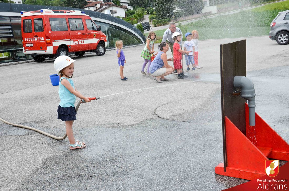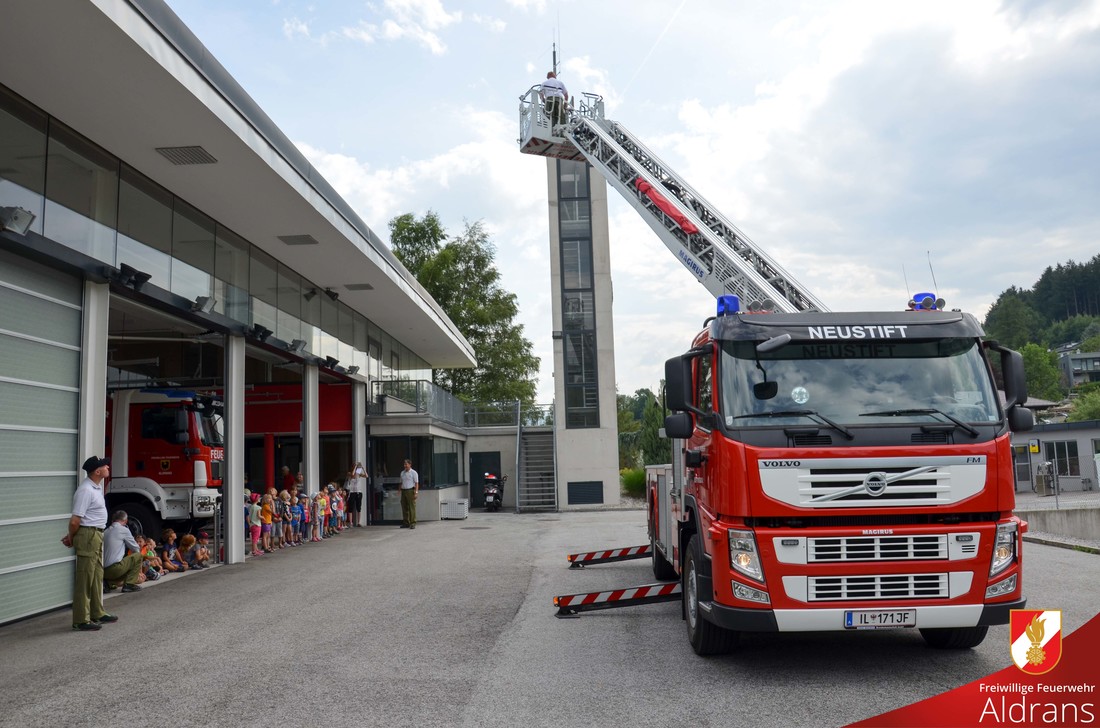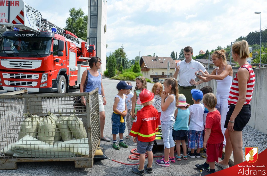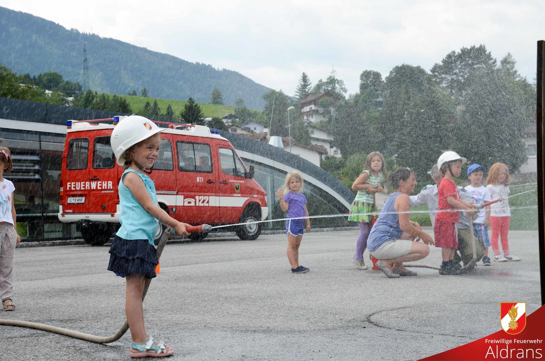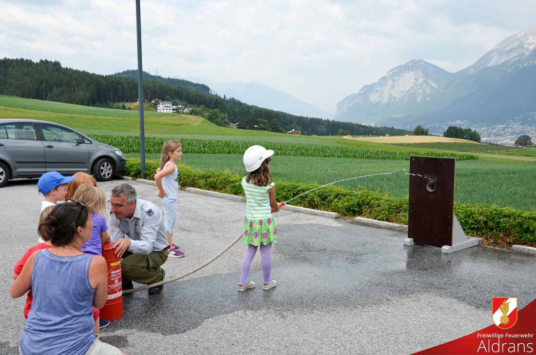 Auf dem Parkplatz waren die Spritzwände der Feuerwehrjugend aufgebaut und die Kinder konnten bei den sehr warmen Temperaturen mit den Kübelspritzen sich etwas abkühlen. Die letzte Station galt der Brandschutzerziehung mitsamt einer kurzen Führung durch das Gerätehaus. Als Highlight wird von unserem Kommandanten immer ein Spezialfahrzeug zu dieser Vorführung eingeladen. In diesem Jahr stellte die Feuerwehr Neustift im Stubaital ihre DLK 23-12 den Kindern vor. Selbstverständlich wurden die Tanten in luftige Höhen mitgenommen.