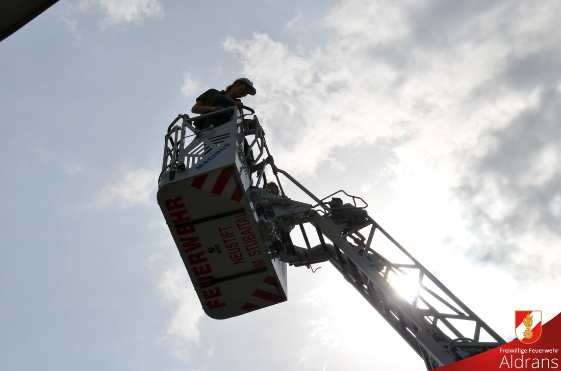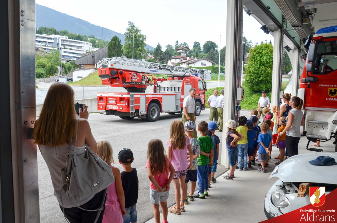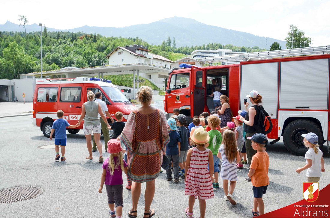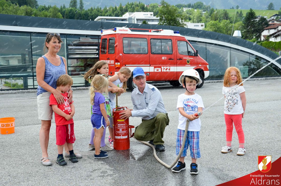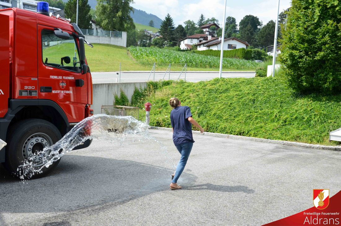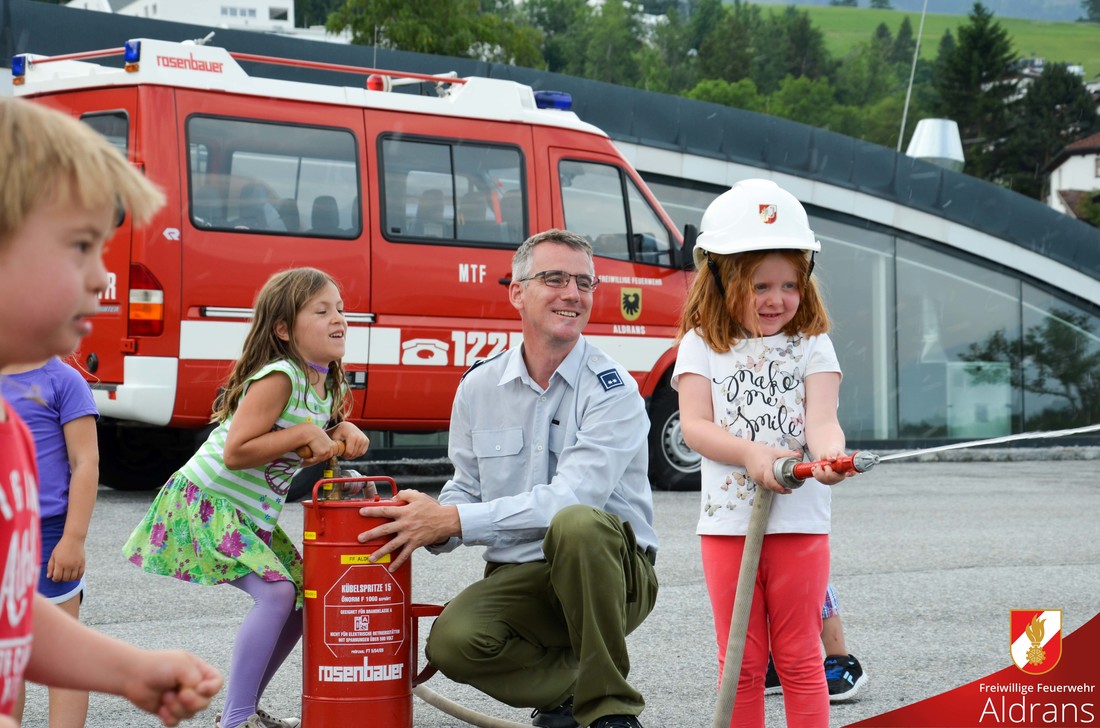 Auf dem Parkplatz waren die Spritzwände der Feuerwehrjugend aufgebaut und die Kinder konnten bei den sehr warmen Temperaturen mit den Kübelspritzen sich etwas abkühlen. Die letzte Station galt der Brandschutzerziehung mitsamt einer kurzen Führung durch das Gerätehaus. Als Highlight wird von unserem Kommandanten immer ein Spezialfahrzeug zu dieser Vorführung eingeladen. In diesem Jahr stellte die Feuerwehr Neustift im Stubaital ihre DLK 23-12 den Kindern vor. Selbstverständlich wurden die Tanten in luftige Höhen mitgenommen.