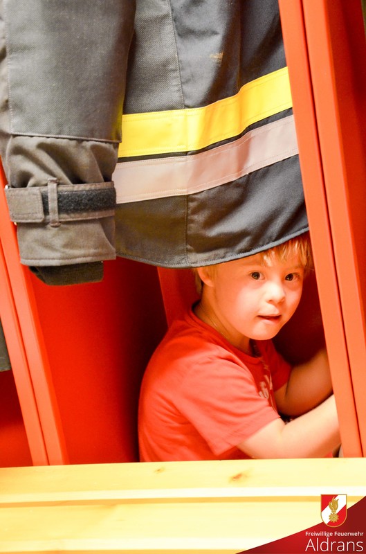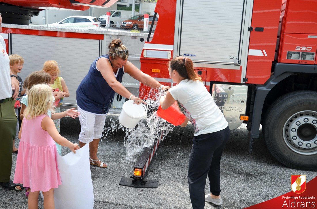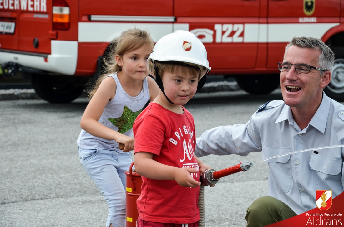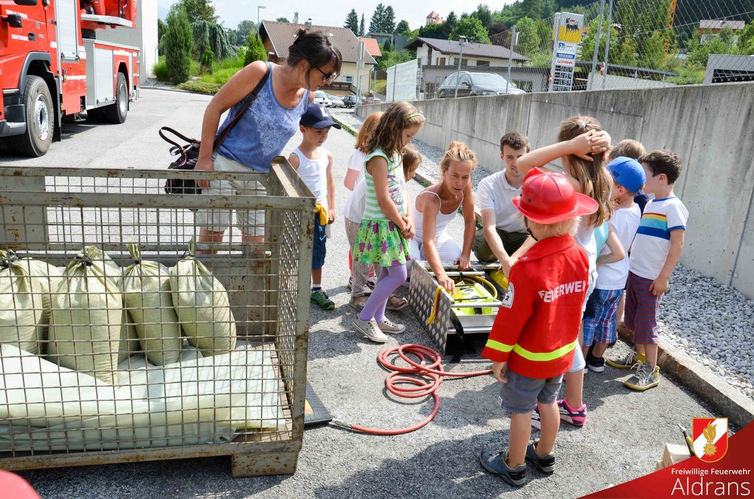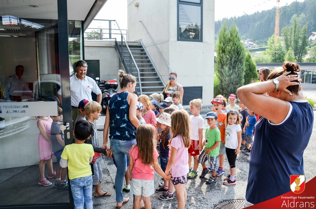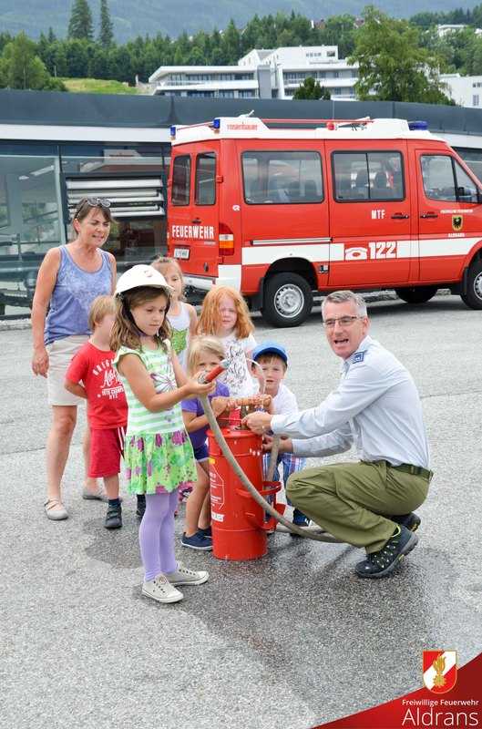 Auf dem Parkplatz waren die Spritzwände der Feuerwehrjugend aufgebaut und die Kinder konnten bei den sehr warmen Temperaturen mit den Kübelspritzen sich etwas abkühlen. Die letzte Station galt der Brandschutzerziehung mitsamt einer kurzen Führung durch das Gerätehaus. Als Highlight wird von unserem Kommandanten immer ein Spezialfahrzeug zu dieser Vorführung eingeladen. In diesem Jahr stellte die Feuerwehr Neustift im Stubaital ihre DLK 23-12 den Kindern vor. Selbstverständlich wurden die Tanten in luftige Höhen mitgenommen.