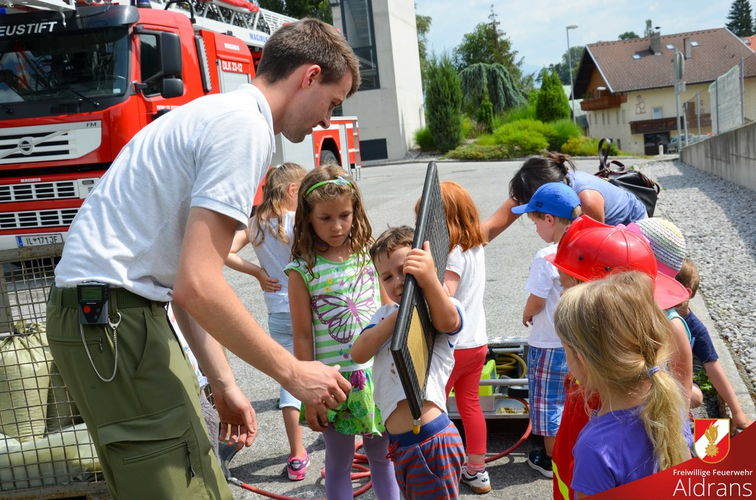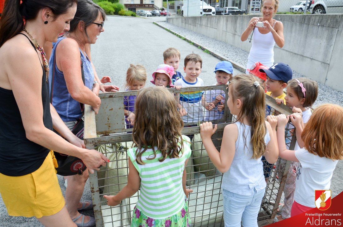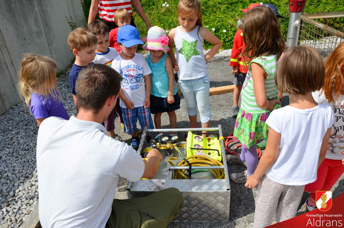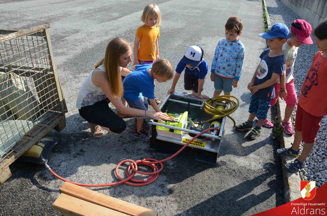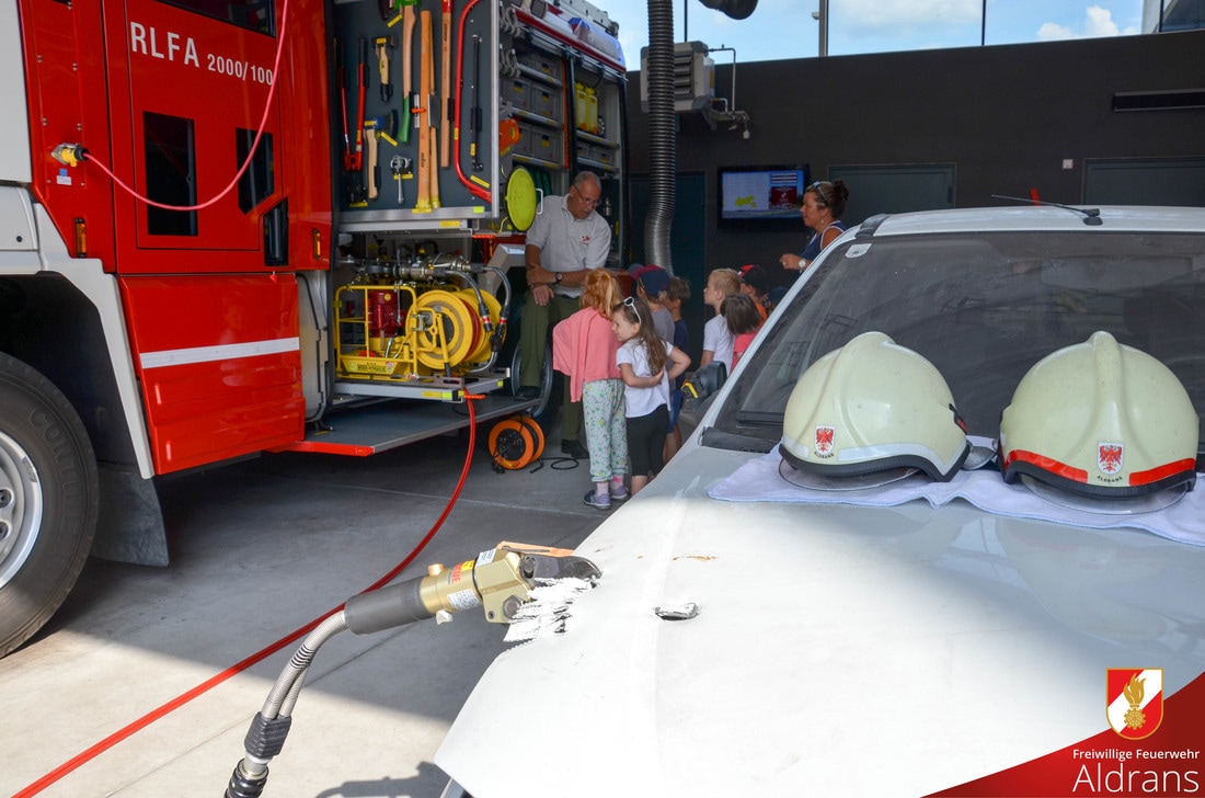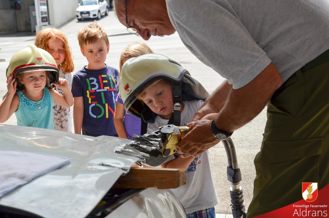 Schon traditionell findet kurz vor den Sommerferien der Besuch des Aldranser Kindergarten in der Feuerwehr Aldrans statt. Bei diesem Besuch gibt es immer spannende Stationen wobei die Kinder direkt eingebunden werden. Bei der ersten Station wurde den Kindern unser RLFA mitsamt der Bergeschere vorgestellt. Hier durfte jeder selbst bei einem Übungsauto mit dem kleinen Pedalschneider das Fahrzeug „zerlegen“. Weiter ging es auf dem Vorplatz. Hier wurde die Stärke der Hebekissen vorgeführt.