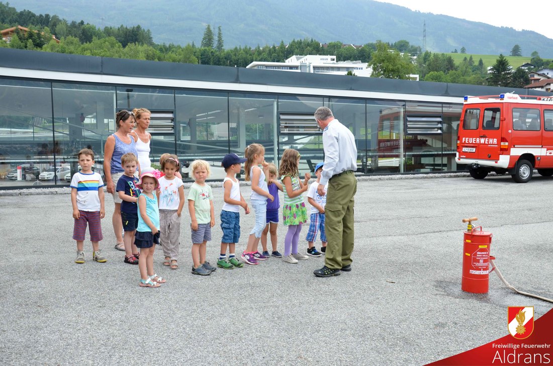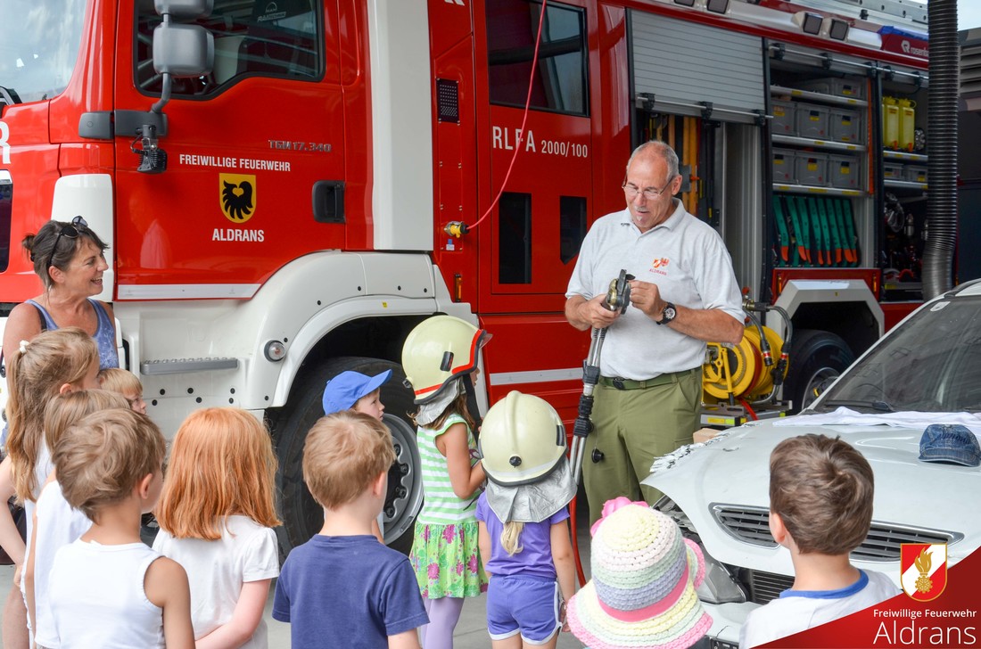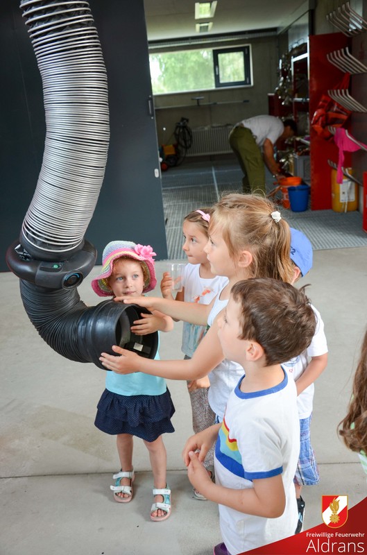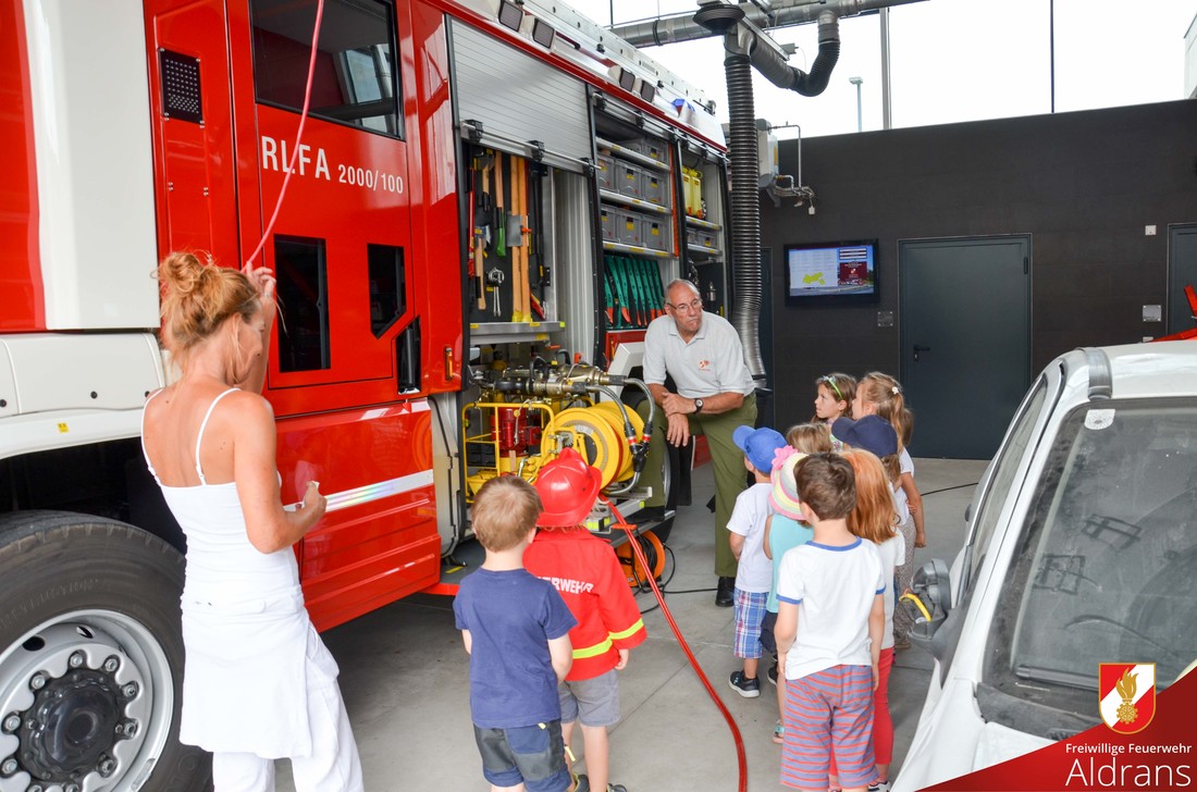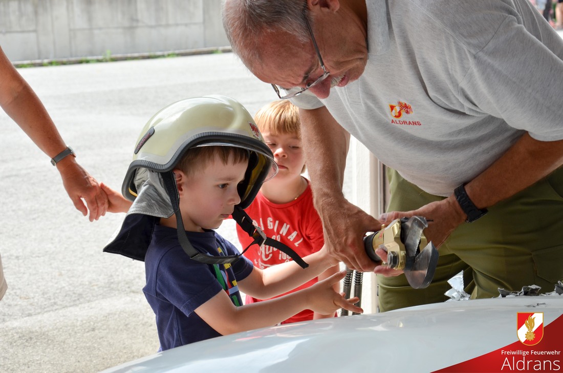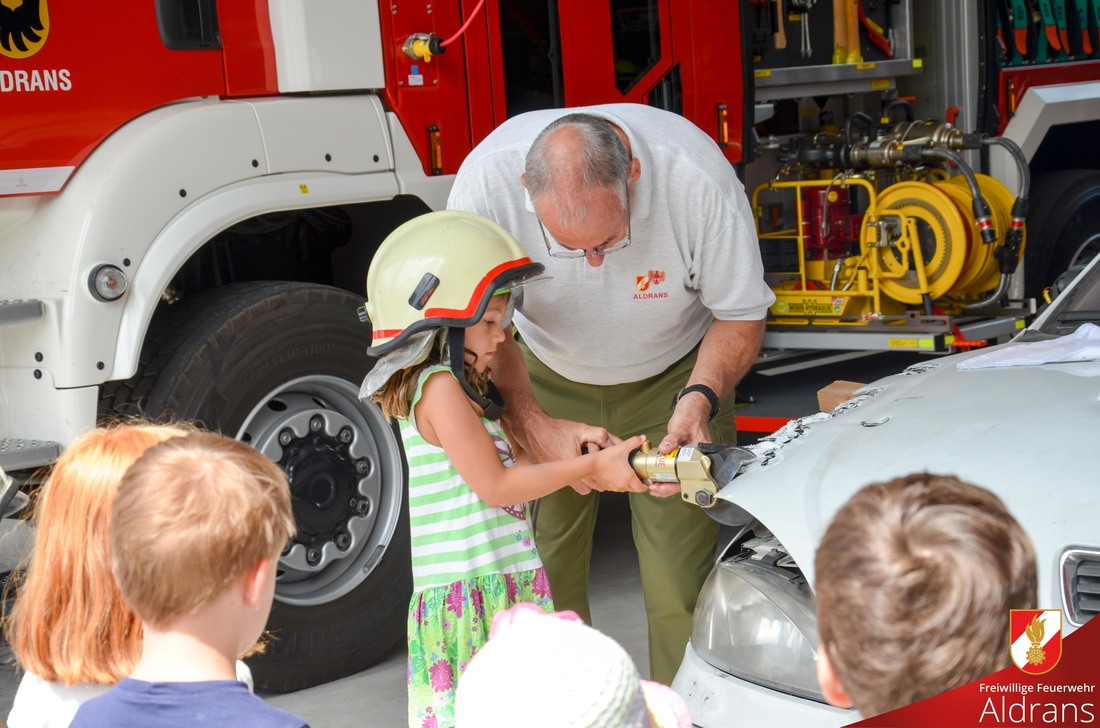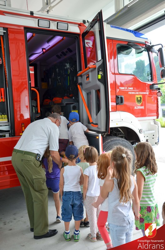 Schon traditionell findet kurz vor den Sommerferien der Besuch des Aldranser Kindergarten in der Feuerwehr Aldrans statt. Bei diesem Besuch gibt es immer spannende Stationen wobei die Kinder direkt eingebunden werden. Bei der ersten Station wurde den Kindern unser RLFA mitsamt der Bergeschere vorgestellt. Hier durfte jeder selbst bei einem Übungsauto mit dem kleinen Pedalschneider das Fahrzeug „zerlegen“. Weiter ging es auf dem Vorplatz. Hier wurde die Stärke der Hebekissen vorgeführt.