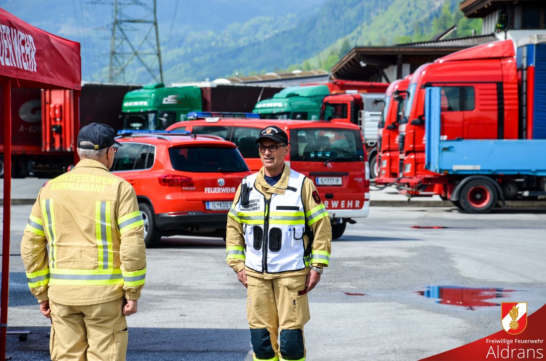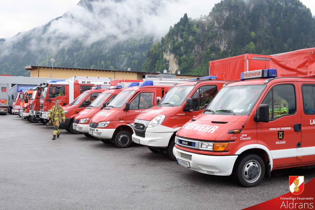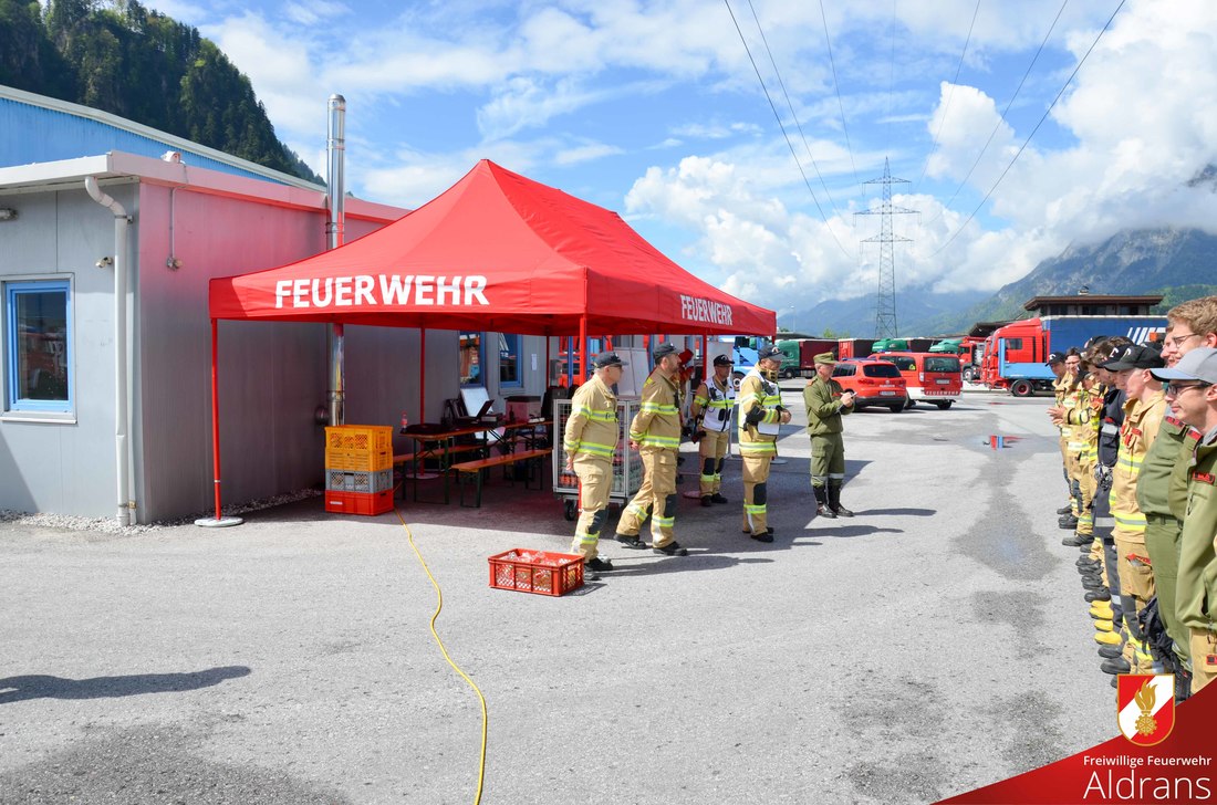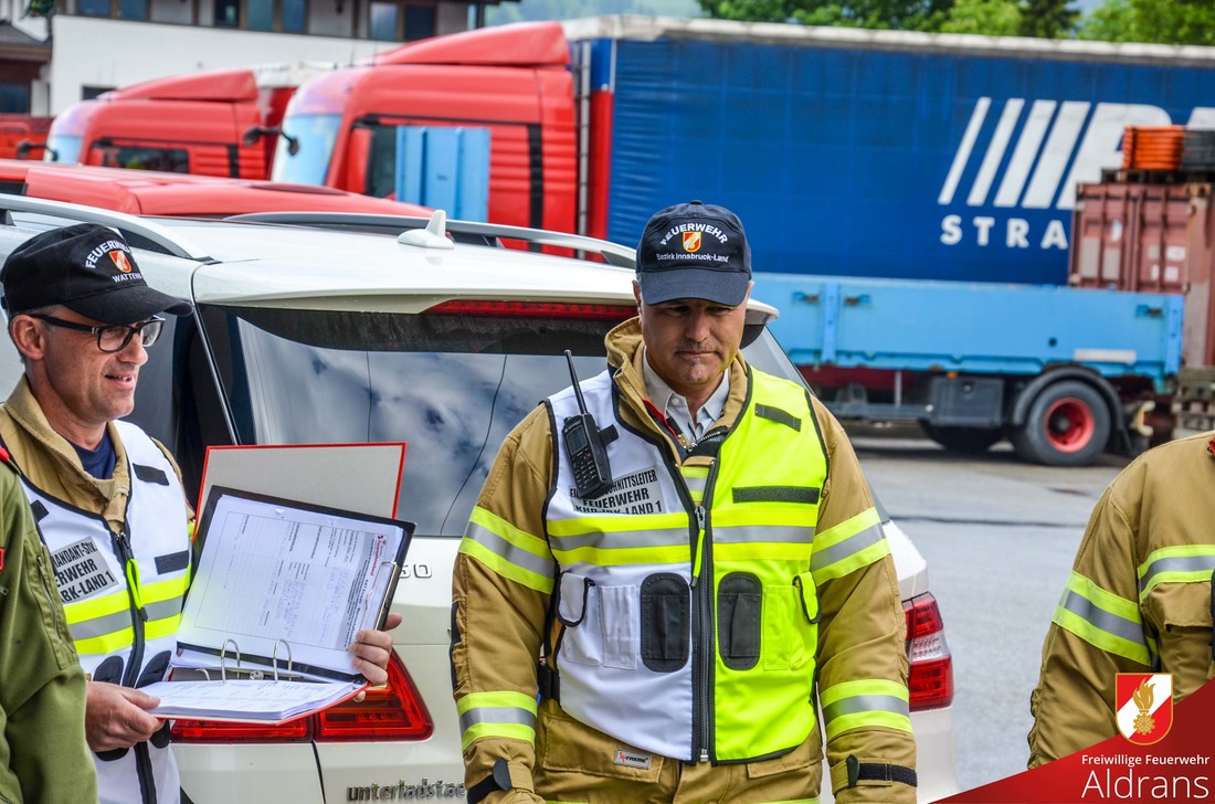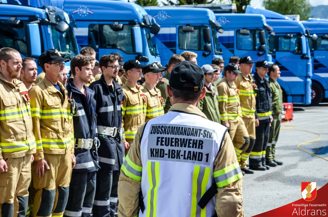 Um im Ernstfall ein reibungsloses Auffahren der Hilfskräfte zu gewährleisten fand am Samstag, 13. Mai, ein Übungstag aller drei KHD-Züge von IBK-Land statt. Die Abschnitte Wattens, Hall und Lans (dazu gehört auch die Feuerwehr Aldrans) gehören zum 1. Zug, dieser traf sich um 8:45 Uhr auf dem Parkplatz der Saline in Hall. 23 Feuerwehren stellten Mannschaft und Gerät zur Verfügung. Nach der Einteilung und Mobilmachung fand die Abfahrt zum Schadensraum statt.
