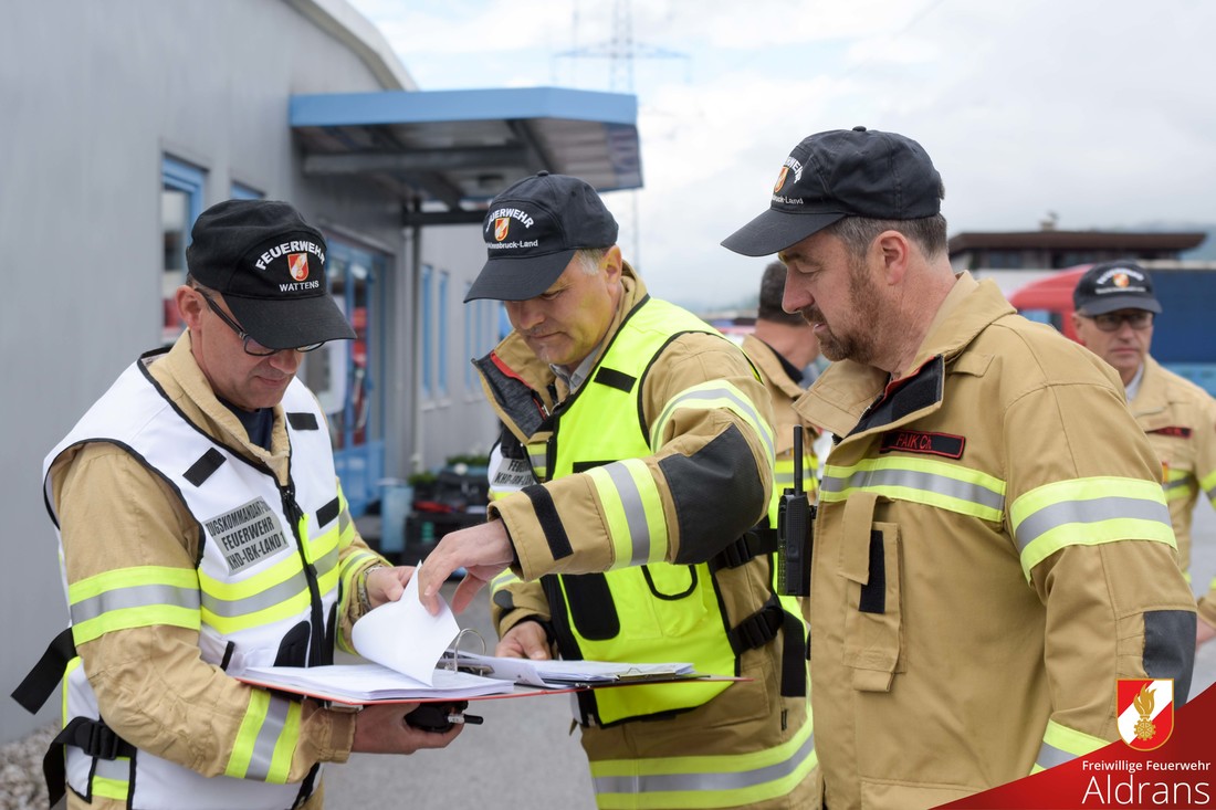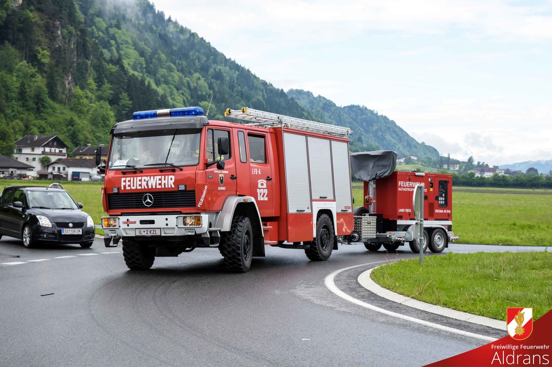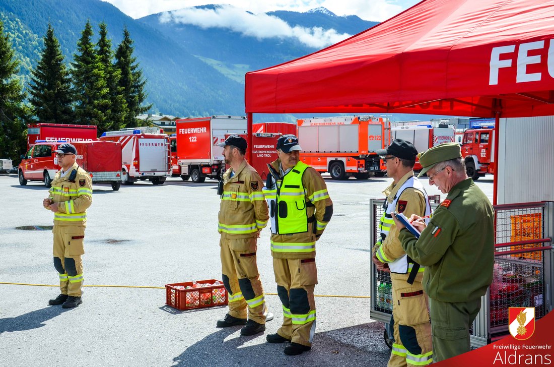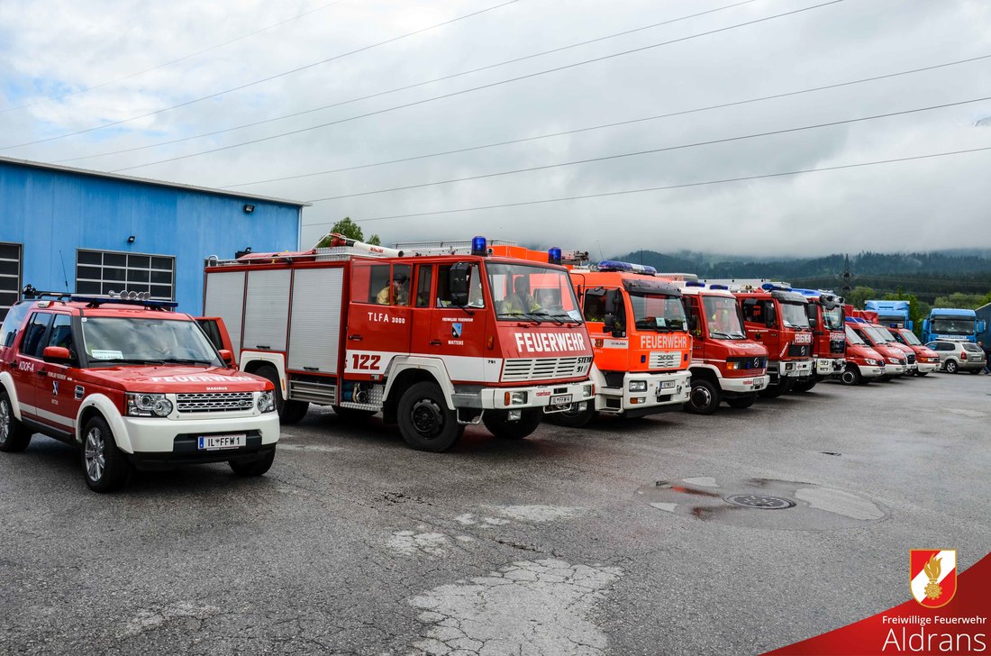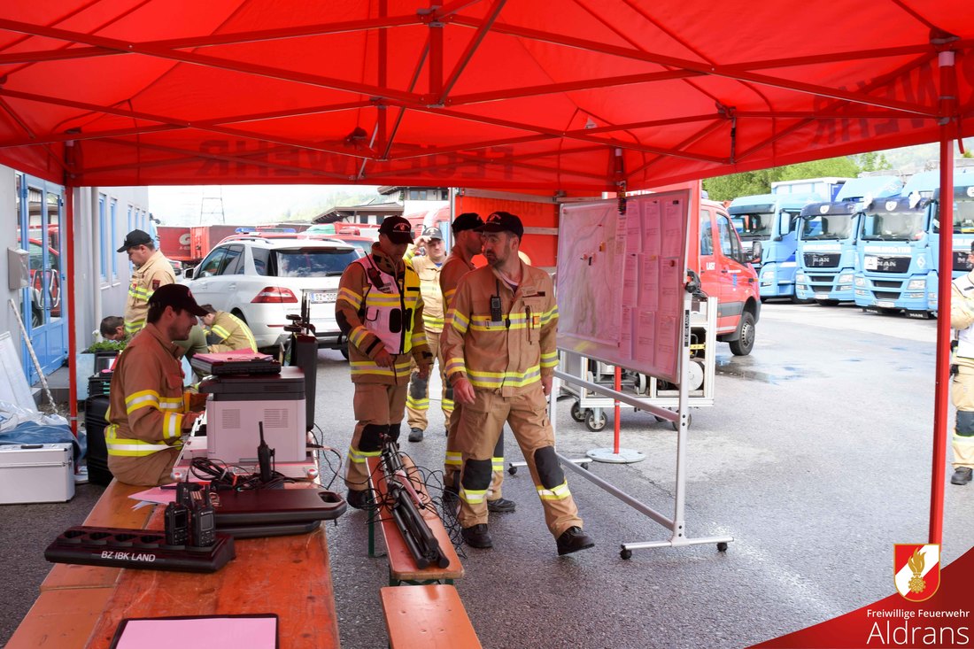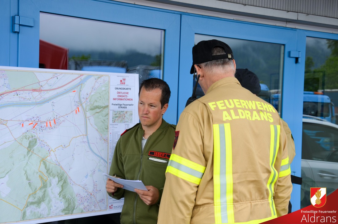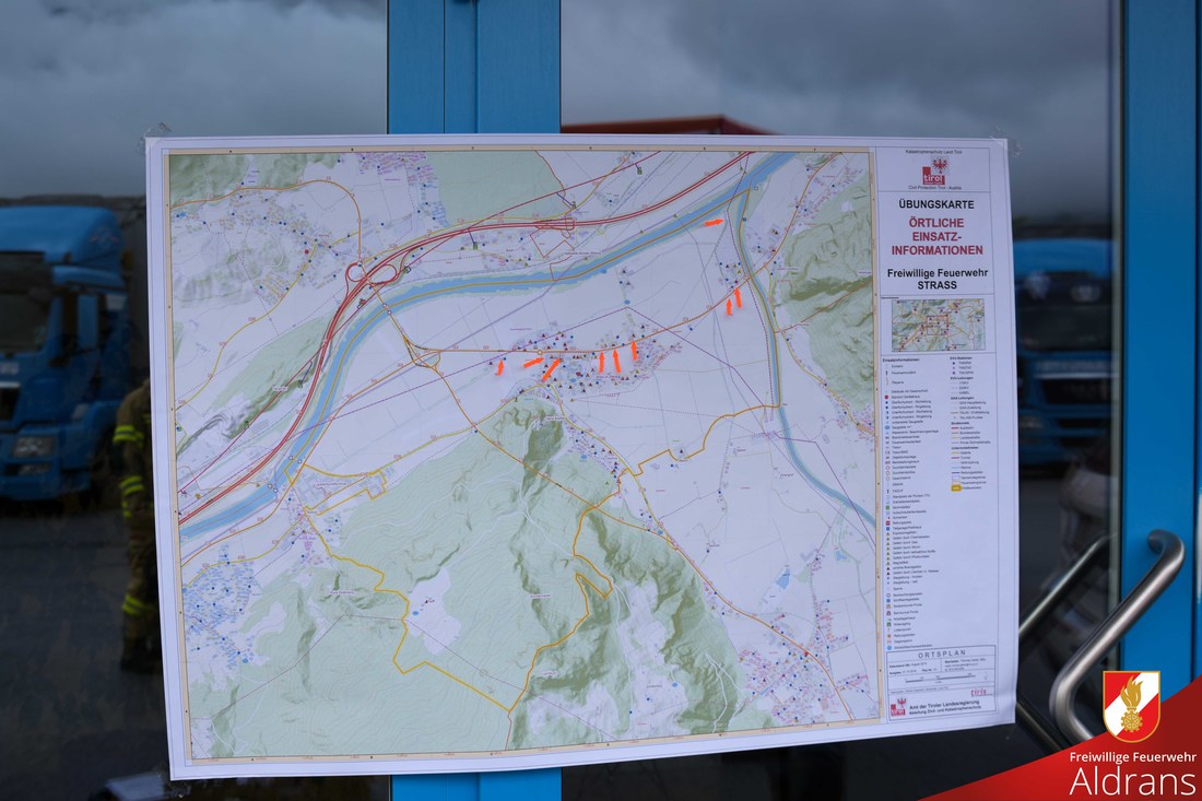 Angenommen wurde, dass im vorderen Zillertal in dem Ort Strass, durch eine Überschwemmung, ein Großschadensereignis eingetreten ist und der Bezirk Schwaz um Unterstützung gebeten hat. An der Sammelstelle in Strass wurde von Einsatzabschnittsleiter AK ABI Werner Strobl die einzelnen Fahrzeuge auf die verschiedenen Objekte verteilt. Die Aufgabe der Feuerwehr Aldrans bestand in der Stromversorgung des örtlichen Abwasserverbandes.